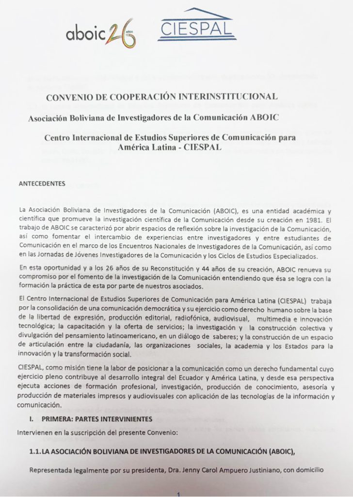 En el marco del III Festival JUNTANZA, “Por la Comunicación desde Nuestra América”, realizado en Quito Ecuador, del 19 al 21 de marzo de 2026, fue renovado el Convenio de Cooperación Interinstitucional entre el Centro Internacional de Estudios Superiores de la Comunicación para América Latina (CIESPAL) y la Asociación Boliviana de Investigadores de la Comunicación (ABOIC).